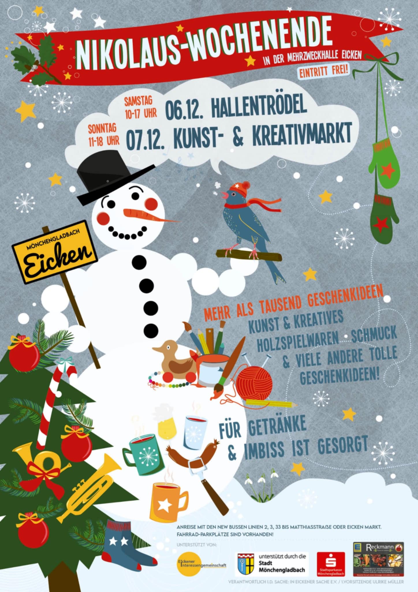 Am 07. Dezember 2025 lädt In Eickener Sache e.V. wieder herzlich zum beliebten Nikolausmarkt in die Mehrzweckhalle Eicken ein. In diesem Jahr steht alles ganz im Zeichen von Kunst und Kreativität – es gibt kein Programm, sondern einen gemütlichen Markt mit liebevoll gestalteten Ständen und handgemachten Arbeiten.
